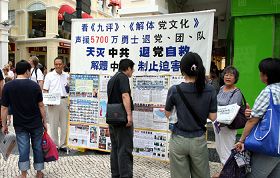 ![]() 澳门法轮功学员在闹市步行街——玫瑰堂前地讲真相,劝三退(退出中共党、团、队)。 |