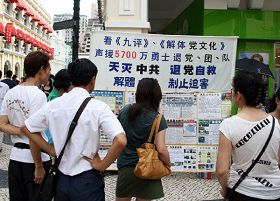 正值暑假,大陆游客很多,尤其是年轻人,都趁学校放假,到澳门观光购物。下午约二点半,学员刚举起横额,就有一位十几岁的年轻人来拿资料,并对学员说:“其实我们都知道,我们私下都互相议论中共的不好,只是没有办法。”学员对他说:“不是没有办法,只要大家都看《九评共产党》,认清中共的真面目,不配合它行恶,它就没办法了。”学员并向他讲述三退的重要性,年轻人点头称是,并当场退了团,同时表示会把三退的讯息带给自己的朋友。