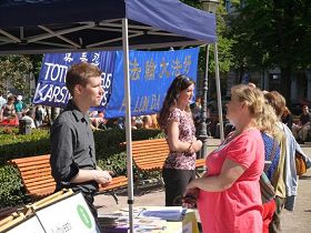 ![]() 学员Olli在向游人介绍法轮功及这场迫害 |