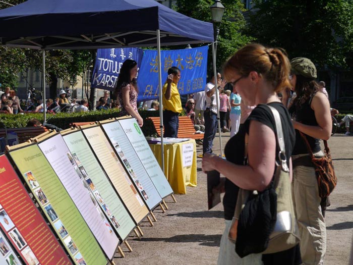 法轮功学员在著名景点赫尔辛基大教堂(简称:白教堂,Helsingin tuomiokikko)前,摆放了真相展板及资料桌,“法轮大法好”、“彻底解体中共 全面停止迫害”等的横幅吸引了人们的目光,很多来自俄罗斯、爱沙尼亚等国的游客一边认真聆听法轮功学员讲述迫害真相,一边将这些真相翻译成母语告知随行的家人。他们赞扬法轮功学员的善良,并祝学员好运。