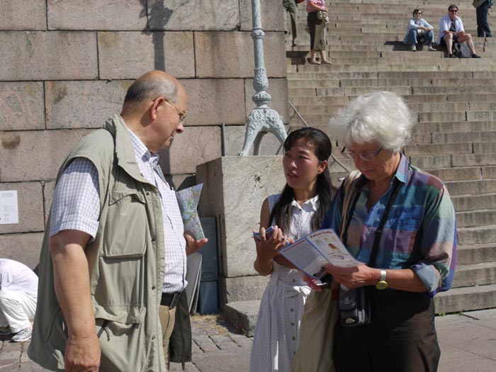有两个老年妇女过来与学员讨论。其中一人住在赫尔辛基,她已经看到了法轮功学员多次在火车站活动,现在把朋友也带来看法轮功。她的这位朋友住在丹麦,她在那里也看到过法轮功。她们都知道共产党对法轮大法的残酷迫害,她们认为,共产党是“非常不好的,它害怕法轮功学员用自己的脑子去思考 ”。