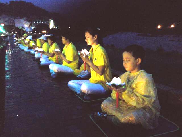当夜色逐渐笼罩大地,河堤上的法轮功学员开始点燃一朵朵的烛光莲花,悼念在中国大陆被迫害致死的同修,此时天空忽然下起了雨,似乎也在同声哀悼这些坚忍不屈的勇者。陆续驶进知本的一辆辆游览车上,大陆游客注视着这肃穆庄严的场面。