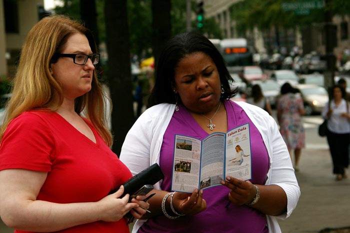 ![]() 街旁民众关注反迫害的大游行,在街上阅读真相传单 |