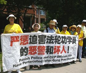 ![]() 二零零九年七月二十日,多伦多法轮功学员在中领馆前集会,吁制止迫害。 |