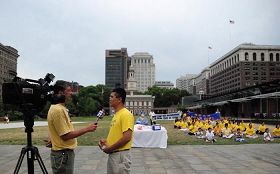![]() 费城Fox29 电视台采访法轮功学员。 |