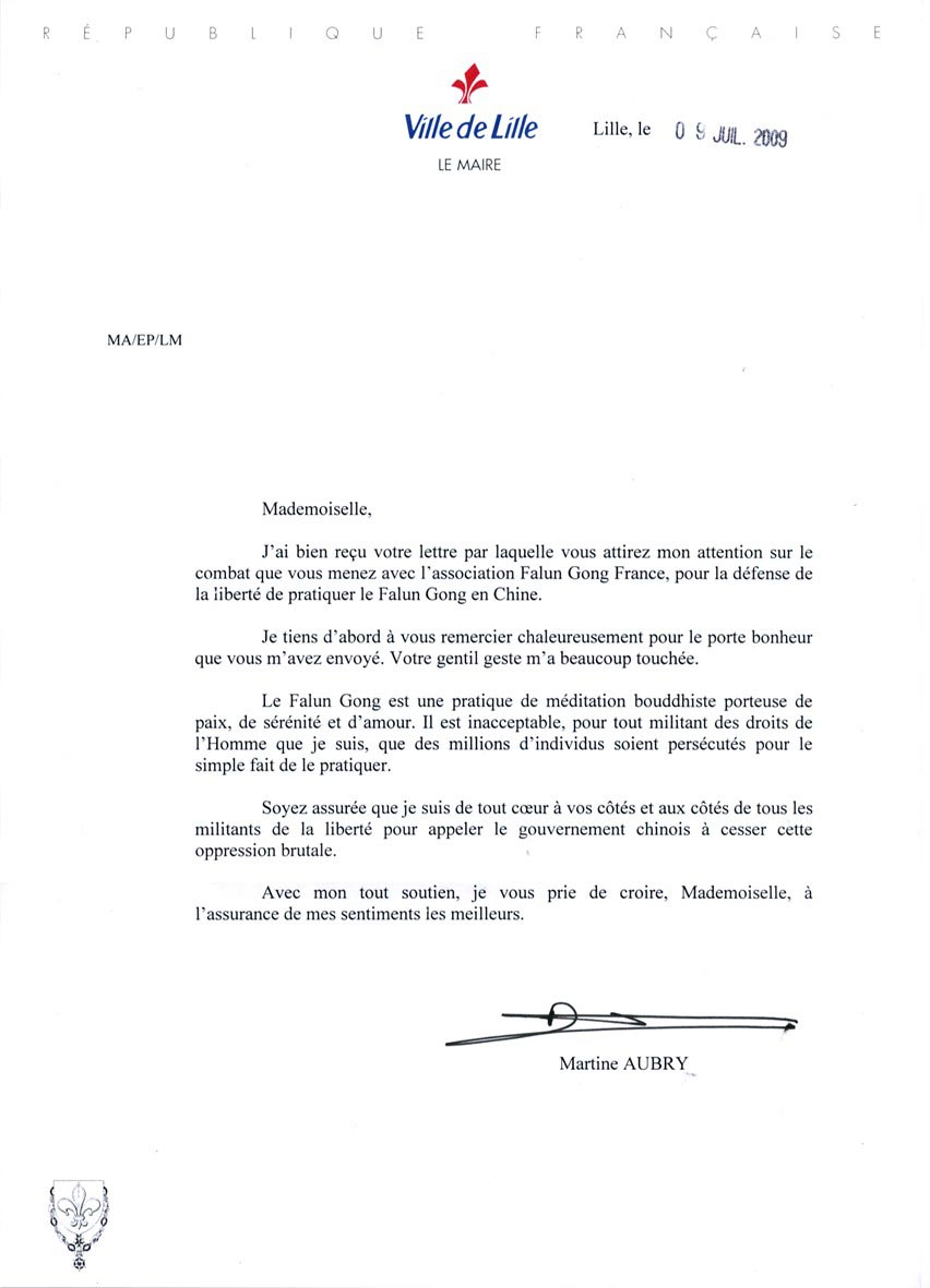 【明慧网二零零九年七月二十二日】法轮功学员和平反迫害十周年之际,法国最大在野党社会党第一书记(相当于总书记)兼里尔市(Lille)市长马尔婷·奥布里女士(Martine Aubry)致函法轮功学员表示,迫害法轮功是不可接受的,并要求中共政府停止这一野蛮镇压。