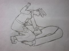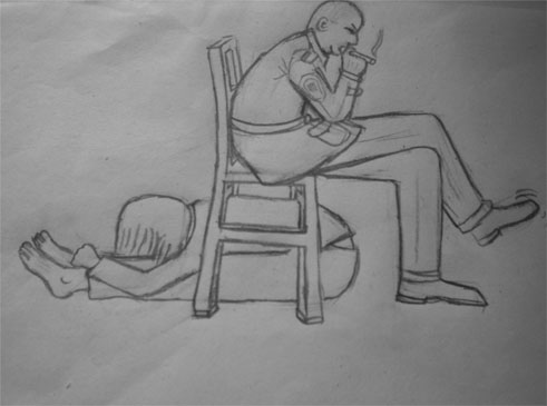 事发当天,恶警将刘丹绑架到鸡冠区公安分局。恶警王伟军将刘丹双手背铐,让其长时间面墙体罚,并用污言秽语谩骂。夜间,又将刘丹的双手高高的倒扣在铁门上,绑上双脚,人只能弯腰头朝下,此种姿势让人疼痛难忍(演示图1)。之后,王伟军强迫刘丹摁指纹,刘丹不按,他就让刘丹钻到凳子底下,被刘丹拒绝,王伟军一脚把刘丹绊倒,刘丹的头部重重的撞击到地面上,然后王强行把刘丹的双腿并在一起,头贴在双腿上,用凳子压在刘丹的背上,王坐在凳子上一上午(演示图2)。