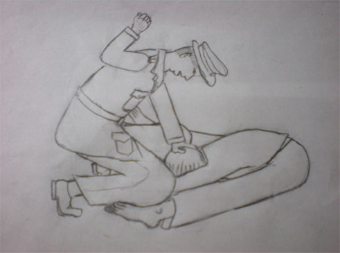 25日下午,张伟将大法师父的照片用皮筋绑在刘丹的脚下,刘丹趁他不注意,将照片藏在后背。张借搜照片之际,强行将刘丹外衣扣子扯下两个。晚上,焦阳知道此事后,对刘丹进行侮辱,在有多名男警察在场的情况下,将刘丹的衣服掀起至胸部,狠毒的掐刘丹的肚子,让她说照片在哪里。王伟军配合焦阳将刘丹踢倒在地,把刘丹的双腿分开,将刘丹的脸摁在地面上进行毒打(演示图3),直到焦阳在刘丹的背部发现照片后才停止。焦阳知道刘丹是未婚女子,下流的说:她是黄花闺女。