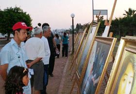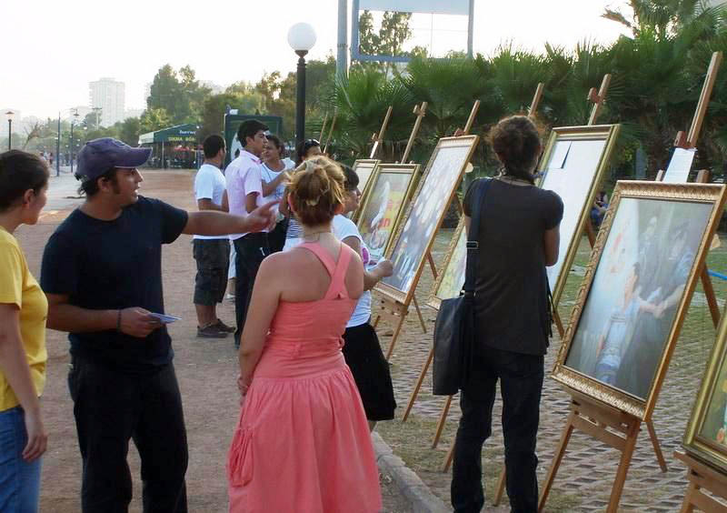十几幅一字排开的揭露中共残酷迫害法轮功学员的画作,使很多人的心灵受到了震撼。法轮功学员们一遍遍地向人们讲述中共在过去十年里,迫害按照“真善忍”修心做好人的法轮功学员,甚至活摘法轮功学员器官牟利的事实。