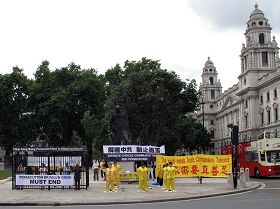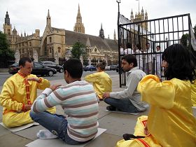 ![]() 英国议会广场上,法轮功学员演示功法,以反酷刑展揭露中共迫害 |