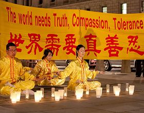 夜幕降临,参加反迫害十周年集会的法轮功学员点燃了盏盏烛光,寄托对遭中共迫害致死的三千二百多位大陆同修的缅怀和悼念。入夜,大本钟敲响了二零零九年七月二十日的最后一次钟声,法轮功学员制止迫害的心更加坚定。
