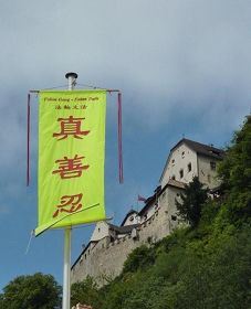“法轮大法-真、善、忍”旗帜(背景为列支敦士登皇室住宅)