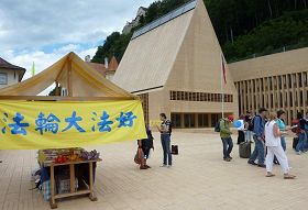 【明慧网二零零九年七月二十三日】二零零九年七月二十日,法轮功学员来到列支敦士登首都瓦都兹的国会和政府大楼前,呼吁制止发生在中国的对法轮功的迫害。这是刚刚成立的列支敦士登法轮大法学会发起的活动。