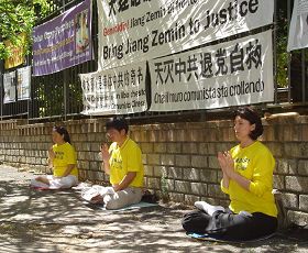 在活动中,学员们用真相展板向人们揭露中共恶党对法轮功修炼者残酷迫害的野蛮行径,并悬挂起“法轮大法教人真、善、忍”、“天理昭昭 审判江泽民”、“天灭中共 退党自救”等横幅。部份学员向过往的行人和游客发资料讲真相,另一部份学员演示功法。