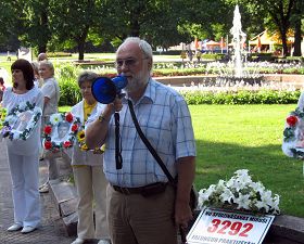 ![]() “共产体制下的政治犯和受害者国际协会”成员彼特里斯•西姆松斯集会上发言 |
