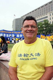 从夏威夷(HAWAII)赶来的约翰(JOHN)已是第三次参加华盛顿DC的反迫害活动,他修炼法轮功的第一次炼功后就轻松戒烟了,从此感觉体能增加,精力充沛。他说:“我得法已九年了,我感到获益很多,我比以前有更多的能量,睡得好,压力减小。我希望为人们讲清法轮功真相,制止十年迫害。”