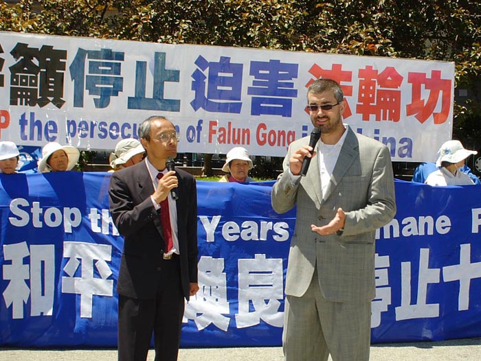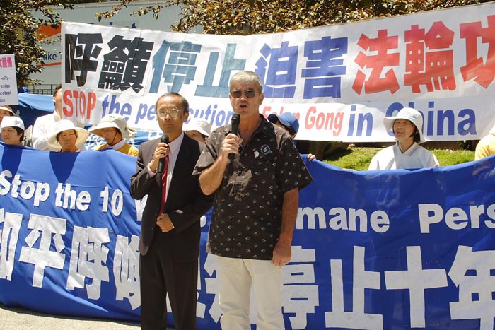 旧金山市议员克里斯·戴利特别来到会场。他说:“我怀着悲痛的心情来到这里,因为我想到十年来在中国大陆被迫害的法轮功学员。同时我也感到欣慰,中国的法轮功学员那种坚忍不屈的精神令我敬佩。作为法轮功的朋友,我可以告诉大家,法轮大法好!真善忍的原则,我们不光要信奉,而且要传给所有的人。我们要谴责所有迫害法轮功的暴徒。在旧金山市政厅,我永远都为你们发言!”