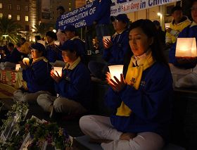 联合广场的烛光守夜夜幕降临,法轮功学员在联合广场点起烛光,悼念被中共迫害致死的法轮功学员。