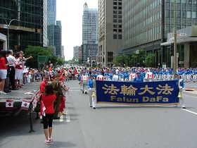 身着印有“法轮大法好”和“真善忍”字样的蓝色T恤,来自纽约和蒙特利尔超过百名法轮功学员组成的天国乐团的队伍,是本次游行中一道亮丽的风景线。天国乐团沿途一遍遍演奏《法轮大法好》、《法鼓法号震十方》、《法正乾坤》、《送宝》、《法轮圣王》和《永远的枫叶》等曲目。乐团所到之处,引来道路两旁观众的阵阵欢呼声和掌声。随着乐团行进,学员将介绍法轮功的传单递给观众,许多人迫不及待地从传单上寻找更多的法轮功信息。