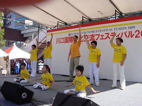 法轮大法天国乐团和明慧学校的法轮大法小弟子们是第一次应邀参加该活动。他们在东京北边门户、终日交通繁忙的川口车站广场舞台上首次亮相,立刻吸引了往来的行人、在周围商业大楼的顾客和搭乘电车的乘客们,人们驻足观看、聆听,并报以掌声。