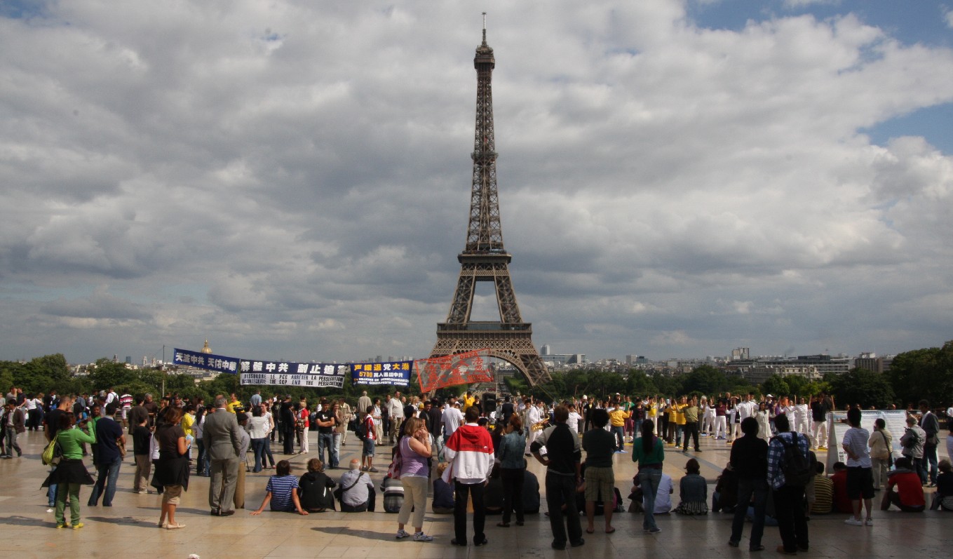 报道说,应法国法轮功协会之邀,一些人随着缓慢的音乐炼了约两个小时的功:一种中国式的瑜伽。他们拉起了带写有“停止在中国迫害法轮功”、或“停止镇压”的横幅和展板。