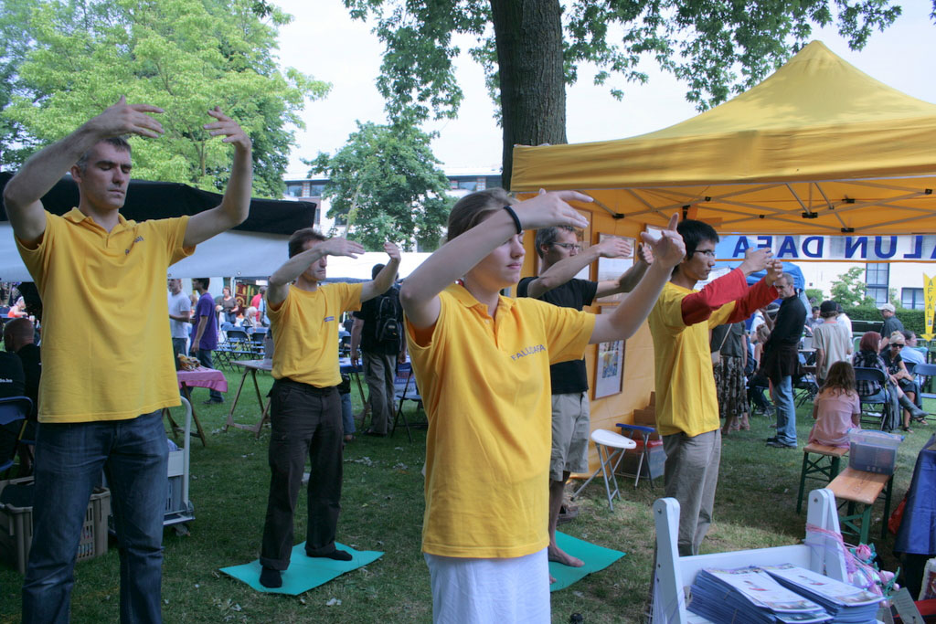 一位游客来到帐篷前向学员表示:自己也在练气功,看到学员们的功法演示,对法轮功产生了浓厚的兴趣。因为看到展板的介绍,他询问了法轮功学员在中国被迫害的情况。 随后详细询问了第五套功法——神通加持法和大法书籍《转法轮》,还交流了他对修炼的专一和吸烟的执著的认识。一名学员向他谈了自己的修炼体会——得法后戒掉了三十年的吸烟习惯等。听到学员的亲身修炼体会,这位游客表示他现在所练的离自己所期望的相距甚远,他将上网阅读大法的书籍,希望借此能够找到更高层次的修炼方法,并期望受益于法轮大法。