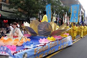 法轮功学员的游行方阵由“法轮大法”巨大横幅开道,紧接着是三名中西方学员分别手持“真、善、忍”三个字,展示法轮大法的修炼真谛;装饰精美的花车上,两名西方学员展示了五套功法,表达出法轮大法功法的祥和美好,有的观众指着正在炼功的学员赞誉道:“她们是荷花仙子啊!”走在花车后面的是法轮功学员们手持印有“法轮大法”“真善忍”字样的五彩旌旗。队伍中无论是老者还是年轻小伙子,学员们精神抖擞地高高举起旌旗,并不时向两旁鼓掌的观众招手致谢。修炼者的祥和乐观的精神风貌颇受好评。