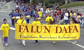 今年法轮功游行方阵包括花车、扇子舞及唐鼓表演。精神抖擞的法轮功学员、震撼人心的鼓声、优美的舞姿加上花车上的功法展示,博得观众热烈的鼓掌。法轮功传单供不应求,许多民众争相接阅,四、五千份传单不到游行结束就全部散发完了。