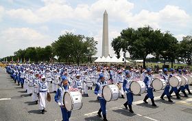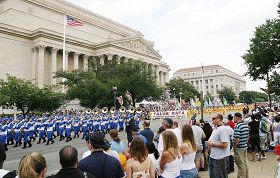 ![]() 2009年7月4日,法轮功团体第八次应邀参加美国首都独立日大游行,由天国乐团、旗队和腰鼓队组成,是所有参加游行的团体中规模最大的。图为天国乐团。 |