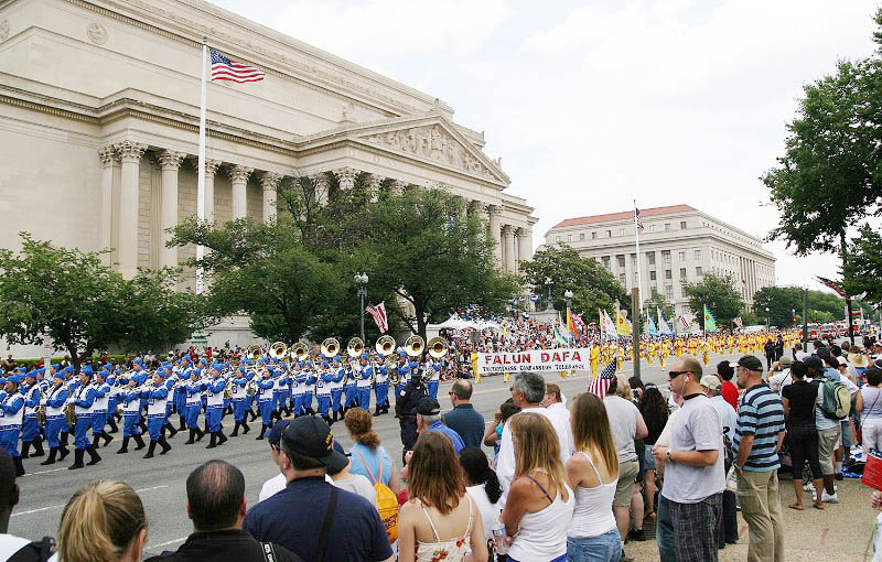 法轮功团体今年第八次应邀参加在宪法大道上举行的美国独立日大游行,其队伍由天国乐团、旗队和腰鼓队组成,是所有参加游行的团体中规模最大的,其中天国乐团一百五十名成员身着清新亮丽的服饰再次在华盛顿亮相,将《法轮大法好》、《法正乾坤》、《法鼓法号震十方》、《法轮圣王下世来》、《美丽的美利坚》五首乐曲带给观看游行的数万观众,成为今年华盛顿国庆游行的一大亮点。宪法大道沿途观看游行的各族裔民众惊叹不已,拍手叫好,第一次见到天国乐团的观众们更是兴奋不已,纷纷询问天国乐团来自哪里。