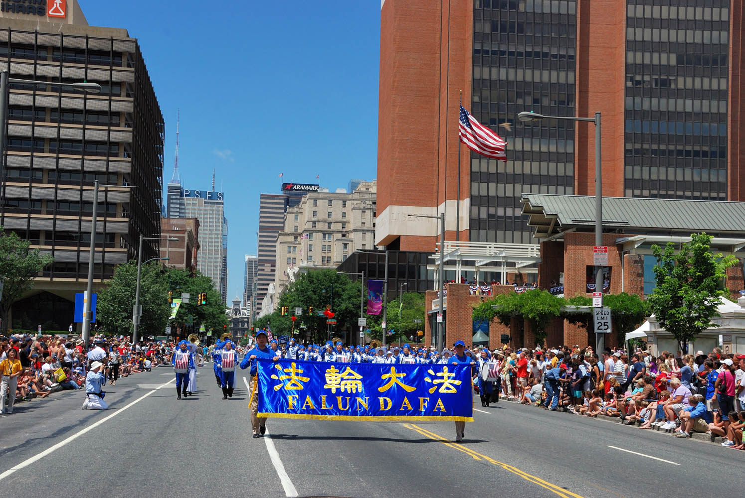 ![]() 参加费城庆祝美国二百三十三岁生日、行进在美国独立宫前的法轮功天国乐团 |