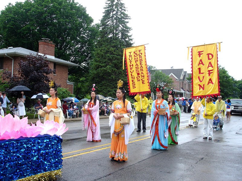 埃文斯敦游行沿着主街道Central街,约三英里长,今年参加的团体有一百二十三个。法轮功队伍是一百多个游行团队中唯一一个以华人面孔为主的团体,但是当地民众对法轮功并不陌生。远隔数十米外便可听到唐鼓的咚咚声和看到“法轮大法”的亮丽旌旗。观众们纷纷鼓起掌来,也有的招手喊着“Falun Gong,Falun Gong(法轮功)”。