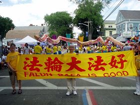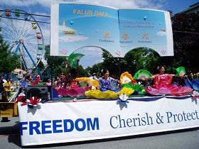 在这些演绎美国过去和现在的游行队伍中,法轮功学员的花车和舞龙队独具一格,四位学员身着中国古典仕女服,坐在花车上的莲花里,随着舒缓优美的“法轮大法好”音乐,优雅地舞动手中亮丽的扇子,花车上面的巨大展板上,在宫廷楼阁的衬托下,告诉观众“法轮功是传统的,以‘真、善、忍’为原则的,身心自我提升的修炼功法”。