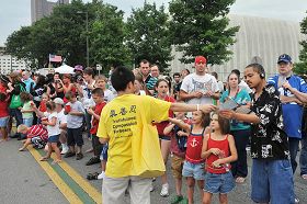 观众争相接过法轮功真相传单