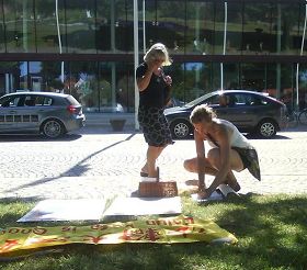 法轮功学员有时还采用另一种更灵活的方式接触当地民众。一个学员举着法轮功真相图片在前面走,另一个学员在后面发资料,穿过闹市。这样能吸引很多行人或在街边喝饮料或用餐的人,效果非常好。