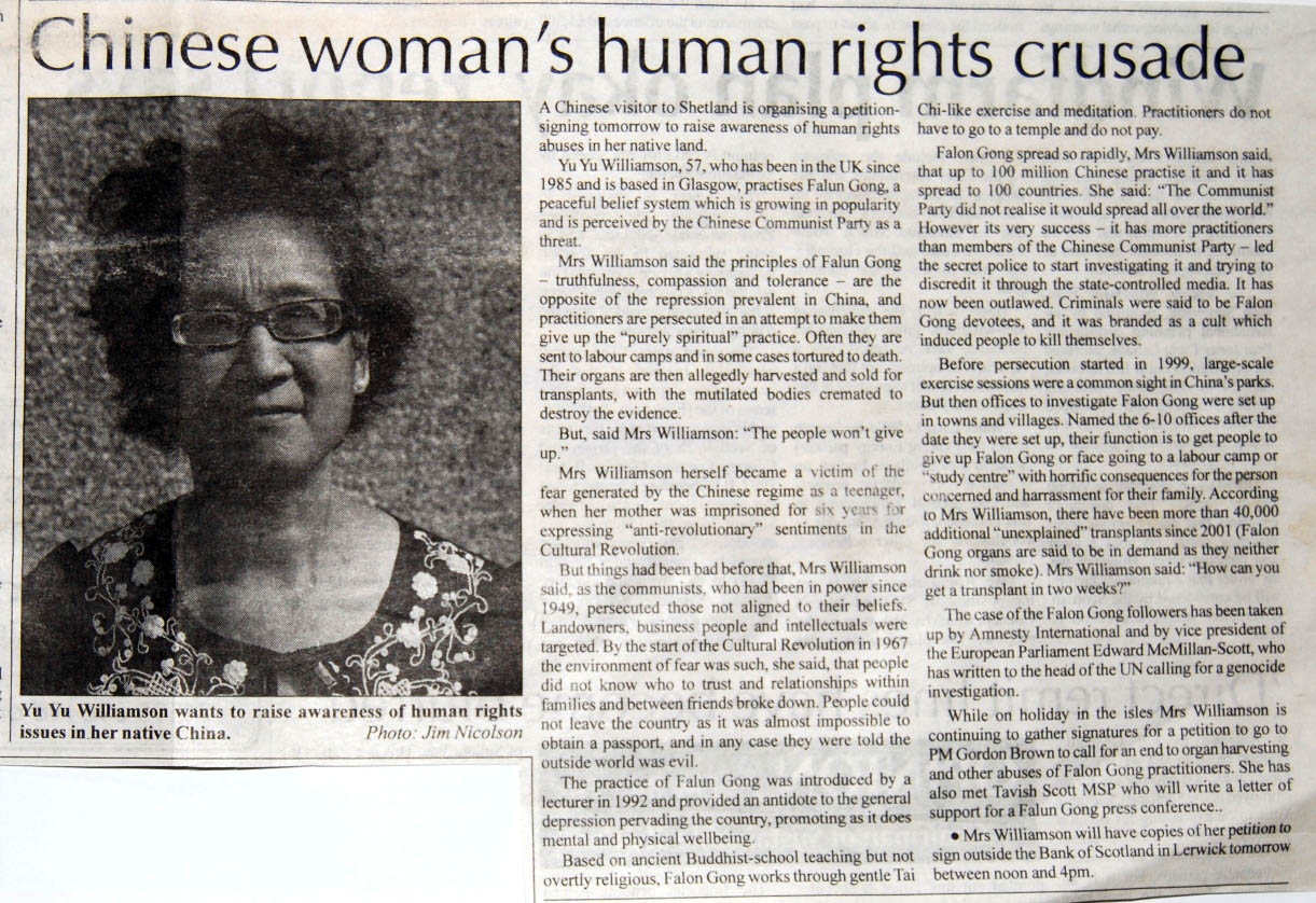 第二天,报纸对法轮功在中国遭受中共残酷迫害作了报道。报道还介绍说,周六,法轮功学员将在首府乐威克(Lerwick)市中心的苏格兰银行前签集反迫害签名。岛上的电台也在节目中对周六的征签活动作了介绍。