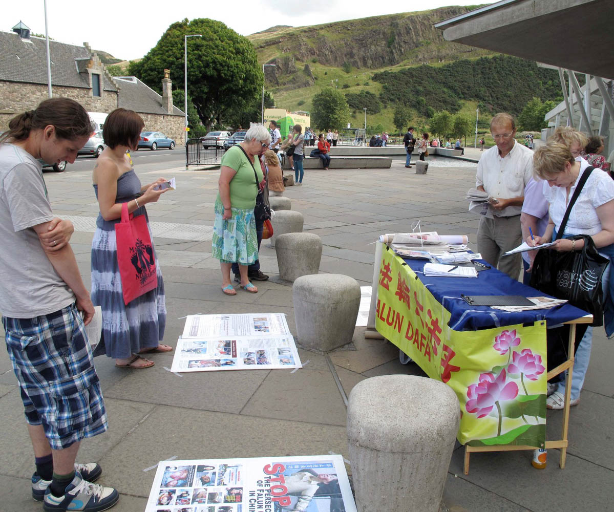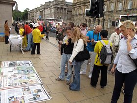二零零九年八月八日至九日(周末),法轮功学员再次汇聚在爱丁堡,除了准备和参加艺术节开幕游行外,部份学员还直接走上街头讲真相。面对大法洪传世界以及法轮功十年来无辜遭受中共迫害的真相,很多人立即表态支持法轮功。