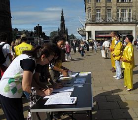 两天下来,法轮功学员们发现,在苏格兰,世道民风相对淳朴,人们在了解真相后也更能选择良知和正义。周六早晨在圣詹姆士小广场,法轮功学员们一开始炼功,就受到过往民众的关注,一些人在简单阅读法轮功被迫害传单后,立即在征签表上签字。