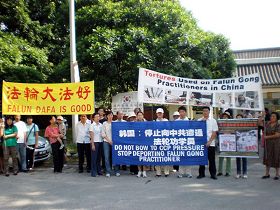 【明慧网二零零九年八月十三日】屈于中共当局的压力,韩国政府二零零九年七月份两次(一日、廿八日)强制遣返了三位申请难民的中国籍法轮功学员。目前又有两名滞留该国的学员可能面临同样对待,这一事件引起国际社会的震惊和关注。许多国家的法轮功学员联系韩国驻当地的使领馆,表达对此事的关切。很多社会人士也呼吁南韩政府保护这些受迫害者,不要屈从中共,出卖人权。