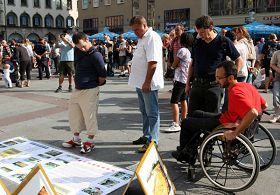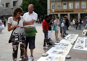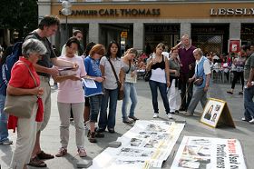 【明慧网二零零九年八月十三日】(明慧记者德祥德国报道)德国南部地区最大城市的慕尼黑(Munich),是一个历史文化名城,每天都吸引着大量来自世界各地的旅游者,市中心的玛丽恩广场(Marienplatz)更是人流络绎不绝。二零零九年八月九日,来自德国巴伐利亚州的部份法轮功学员在玛丽恩广场举办揭露邪恶、制止迫害法轮功的活动,吸引了大量游人和当地德国民众。
