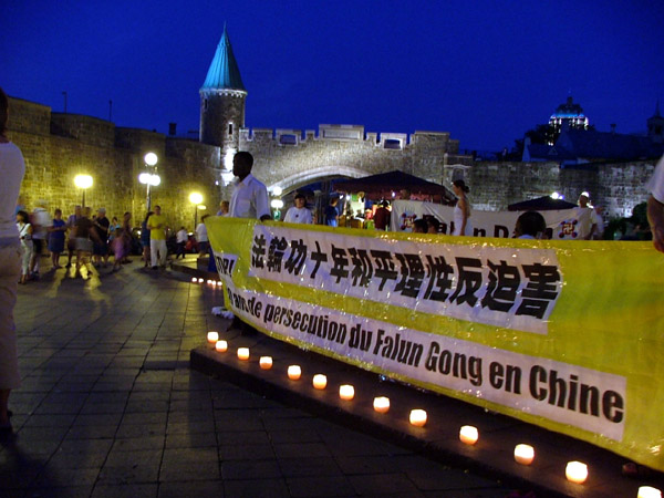 夜幕降临,法轮功学员燃起烛光,悼念因不放弃“真善忍” 信仰而被中共迫害致死的法轮功学员。庄严肃穆的会场感染着围观的人们,他们静静地听着主持人介绍法轮功学员遭受的迫害,直到主持人宣布活动结束。