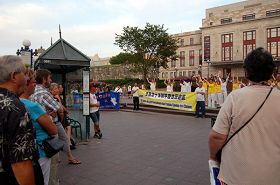 下午三时开始,法轮功学员分成多个小组在多个公园、及繁华街道边的草坪炼功,向来自各地的游客和当地民众介绍法轮功,同时揭露中共对法轮功修炼者的残酷迫害。许多人是第一次听到法轮功的情况,听法轮功学员介绍后,他们久久伫立在路边,观看法轮功学员炼功,有的人还模仿法轮功学员的动作。