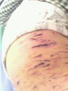6、二零零九年七月十四日下午,李维龙及六监区的监区长李伟楠指使李会武等多名犯人殴打法轮功学员张兴业、杨恭喜等,恶人用树条把张兴业打得全身血肉淋漓,再给他戴上手铐、脚镣,扔到外面曝晒,几乎令他窒息。(附图片)