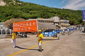 抵达观光景点北竿芹壁村,在湛蓝大海的对岸,隐隐浮现连绵不绝的山峦,正是中国大陆福建。游行队伍顶着艳阳、挥灑着汗水,藉由《法轮大法好》与《送宝》等乐曲,就是要告知对岸民众,把握良机,“退党保平安”。