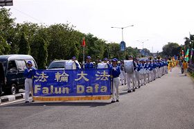 八月十五日下午,天国乐团和腰鼓队以及其他法轮功学员组成的方阵在日惹闹市区举行了长达十公里游行。当地民众们饶有兴致地观赏了天国乐团的演奏,并报以长时间的掌声。沿途有许多人高兴地接受了有关法轮功的真相传单。