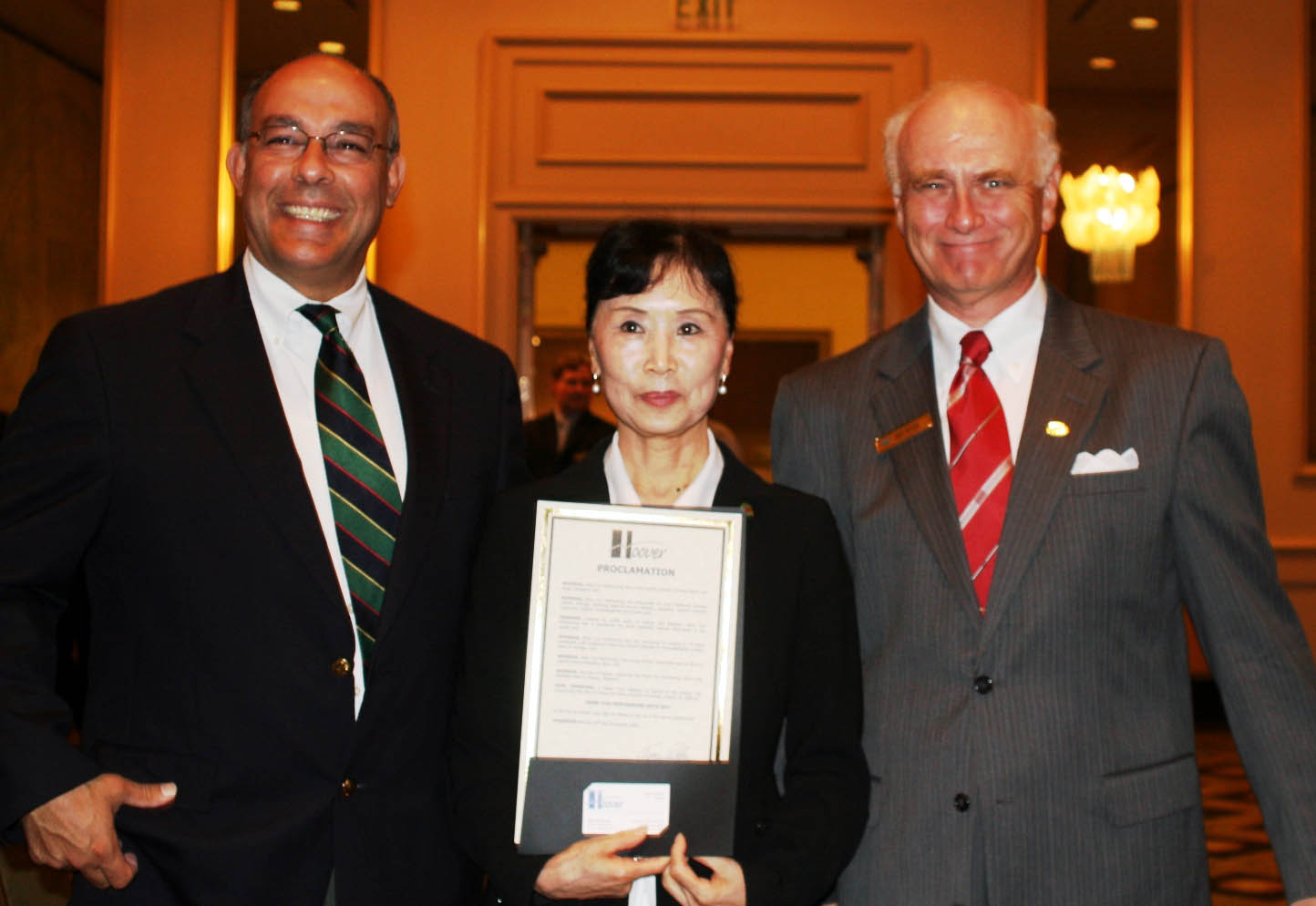![]() 胡佛市(Hoover)市长托尼•彼特洛斯(Tony Petelos)(左)颁发褒奖状给神韵纽约艺术团团长张铁军(中),右为酒店总经理安迪•彼特斯(Andy Peters)。 |