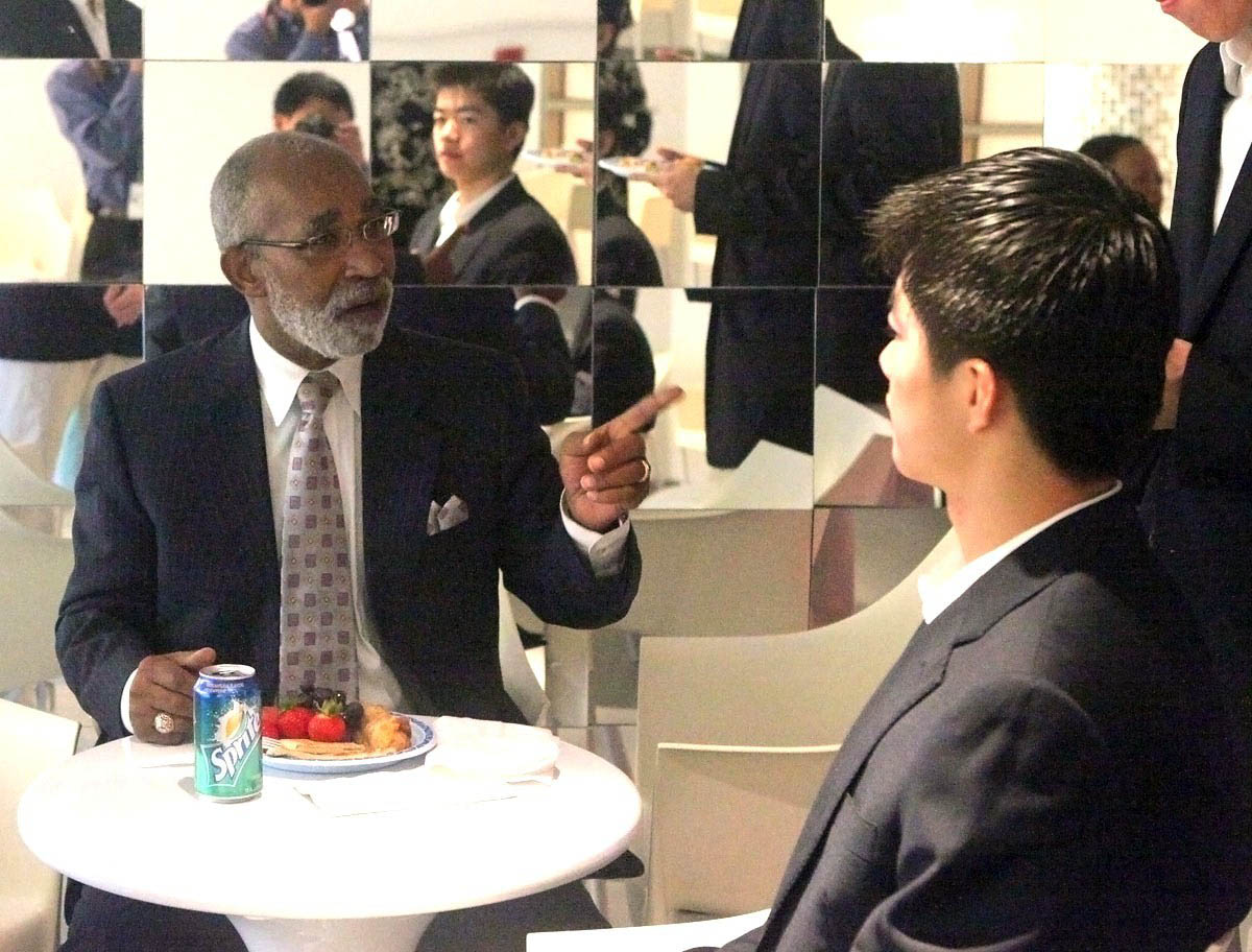 贝斯莫市市长爱德华•梅(左)在晚会后结束后的贵宾接待会中。