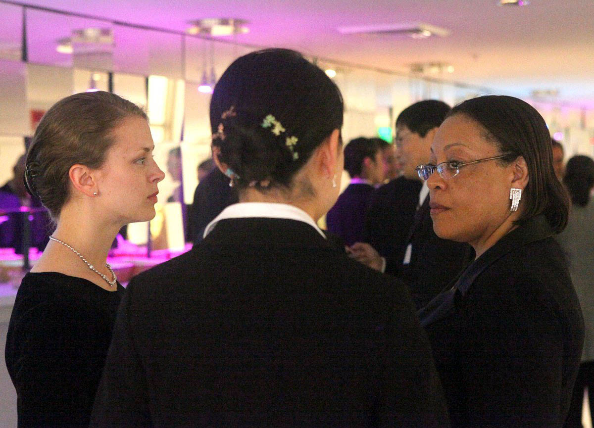 贝斯莫市市长爱德华•梅的太太派翠莎(右)在贵宾接待会中与神韵演员交谈。