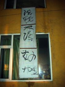 ![]() 霍九先在自家窗户处挂着“法轮大法好”的条幅 |