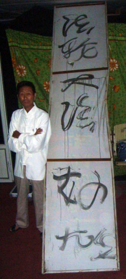 ![]() 霍九先站在自己写的“法轮大法好”条幅旁边,告诉一定要让全世界都知道! |